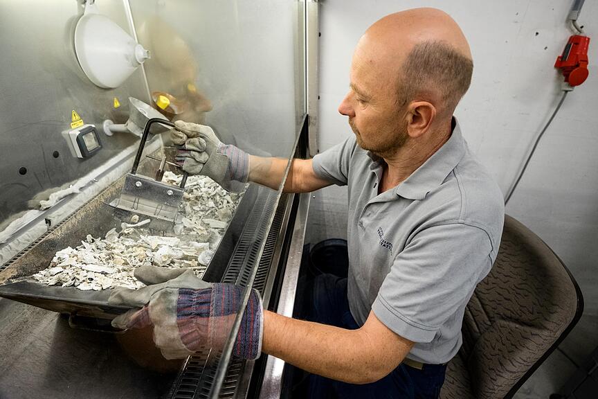 Gut drei Stunden dauert der Prozess vom Hineingleiten des Sargs in den Ofen bis zur Herausnahme der Asche. Auf ein etwaiges unangenehmes Gefühl bei der Arbeit angesprochen sagt Paul Gisler: «Ich denke nicht immer aktiv darüber nach, dass dort gerade ein Mensch verbrannt wird.» Es sei nicht möglich im Krematorium zu arbeiten, wenn die Arbeit einen täglich traurig stimme. Nach dem Einäschern ist der Vorgang noch nicht am Ende angelangt. Der einzige sichtbare Unterschied zwischen den Überbleibseln aus einem Cheminée zu den Reststücken des Einäscherungsprodukts sind Knochenteile, Hüft- oder andere Operationsimplantate, die schwer auf der Asche liegen.