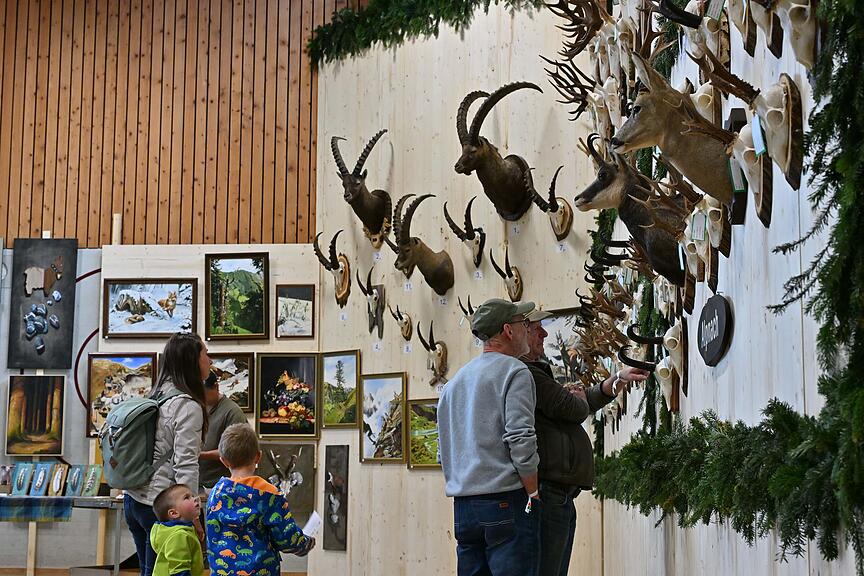 Kinder werden an der Hand der Eltern durch die Sporthalle geführt, bleiben stehen vor dem ausgestopften Büffel, vor dem Marder, vor der Eule mit dem starren Blick. Stände verkaufen Honig, promoten ein Sportcamp oder stellen ihre Gewehre zur Schau. Zwei Herren stehen vor einer Kunstausstellung. Sie verweilen vor den Gemälden, diskutieren Perspektiven, Farbverläufe, Motive. «Welches Tal ist das wohl da hinten?», fragen sie sich, während sie ein Bild fokussiert anschauen.