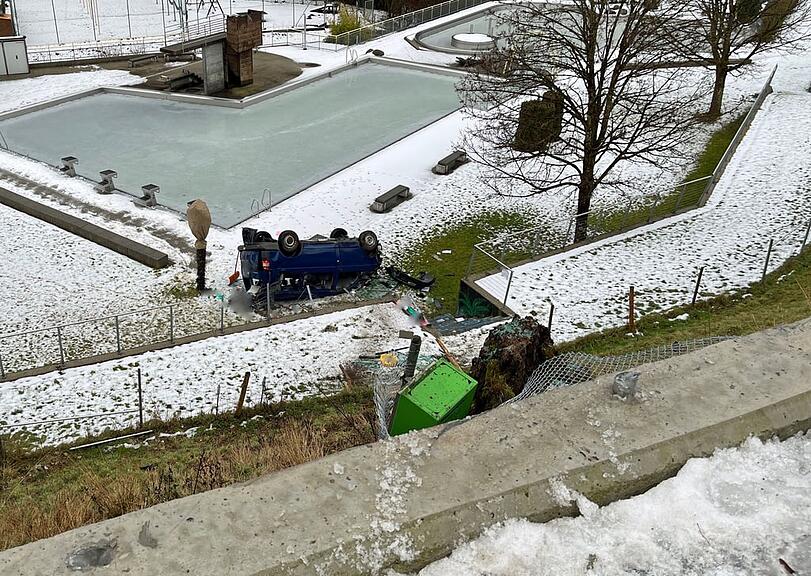 In Wolhusen kam es am frühen Donnerstagmorgen zu einem Selbstunfall, der im geschlossenen Schwimmbad endete. Wie die Luzerner Polizei mitteilt, kam vor 8 Uhr ein Auto im Gebiet Ziehenfeld von der Strasse ab, durchbrach einen Zaun und rutschte den Hang hinunter. Danach überschlug sich das Fahrzeug, durchbrach einen weiteren Zaun und kam auf dem Dach liegend auf dem Rasen des Schwimmbads zu liegen.