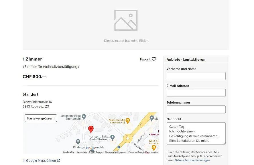 Wenn man auf Immoscout24 nach einer Wohnung im Kanton Zug sucht, stösst man auf ein kurioses Inserat, wie zentralplus berichtet. Keine Fotos, nur eine Preisangabe und in der Beschreibung steht «Für Wohnsitzbestätigung. Übernachtung max. 0-1 Nacht/Woche. Keine Postweiterleitung.»
