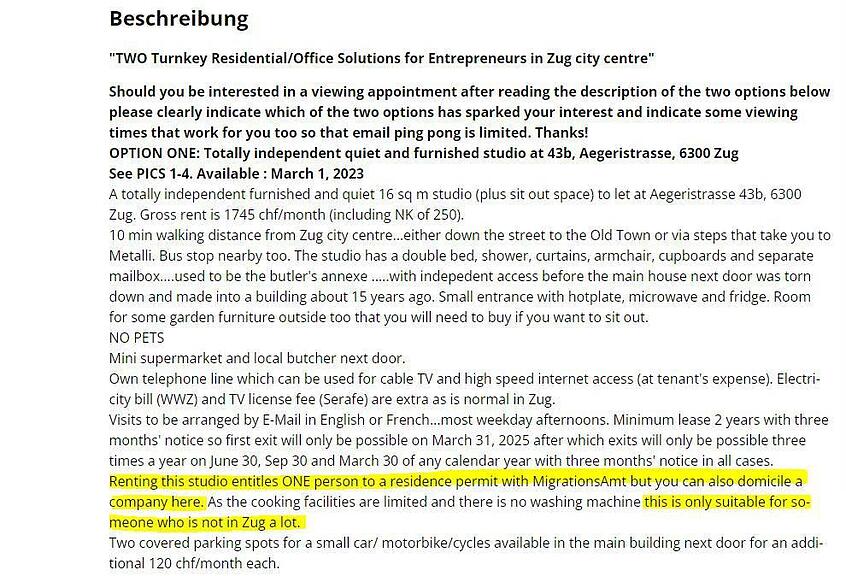 Ein ähnliches Inserat lässt sich auf Homegate finden: 16 Quadratmeter grosses Studio für 1745 Franken. «Renting this studio entitles ONE person to a residence permit with Migrationsamt but you can also domicile a company here. As the cooking facilities are limited and there is no washing machine this is only suitable for someone who is not in Zug a lot», heisst es im Beschrieb.