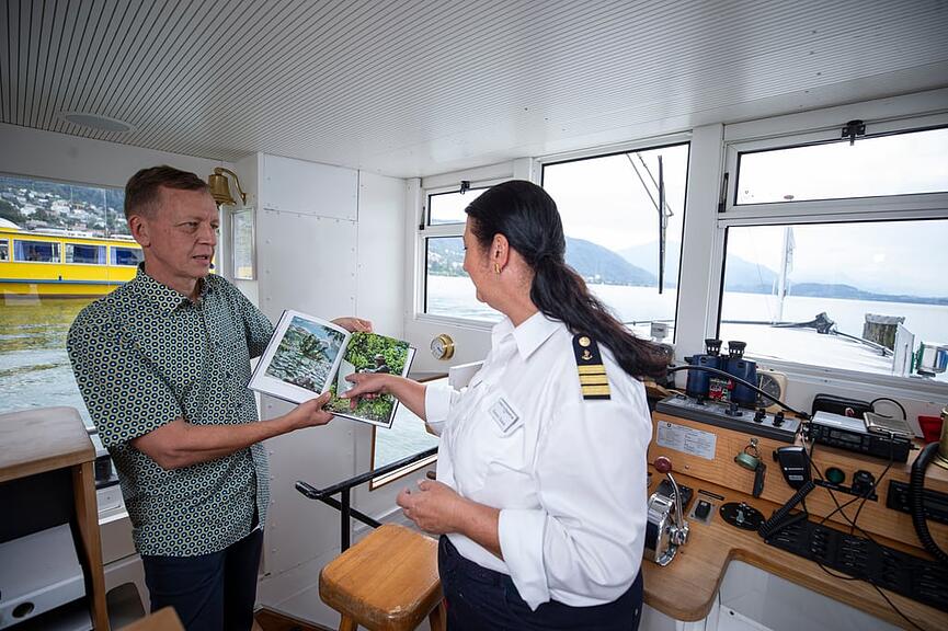 Entsprechend war Thema Nummer 1 unter den geladenen Gästen eben genau diese Art und Weise, wie Lehmpfuhl arbeitet. Unter den gut 30 Anwesenden natürlich auch grosse Verehrerinnen und Verehrer des Künstlers; manche reisten extra aus Hamburg und Berlin an. Zug Tourismus hätte seine helle Freude an dem Wasserspektakel gehabt. Allein durch die Tatsache, dass Kapitänin Zanny Zaum absolut sattelfest in Zuger(see)-Geografie war und ergo jeden Busch am Ufer, jeden Stein an der Bucht und natürlich alle Inseln kannte und dazu immer etwas zu sagen wusste.