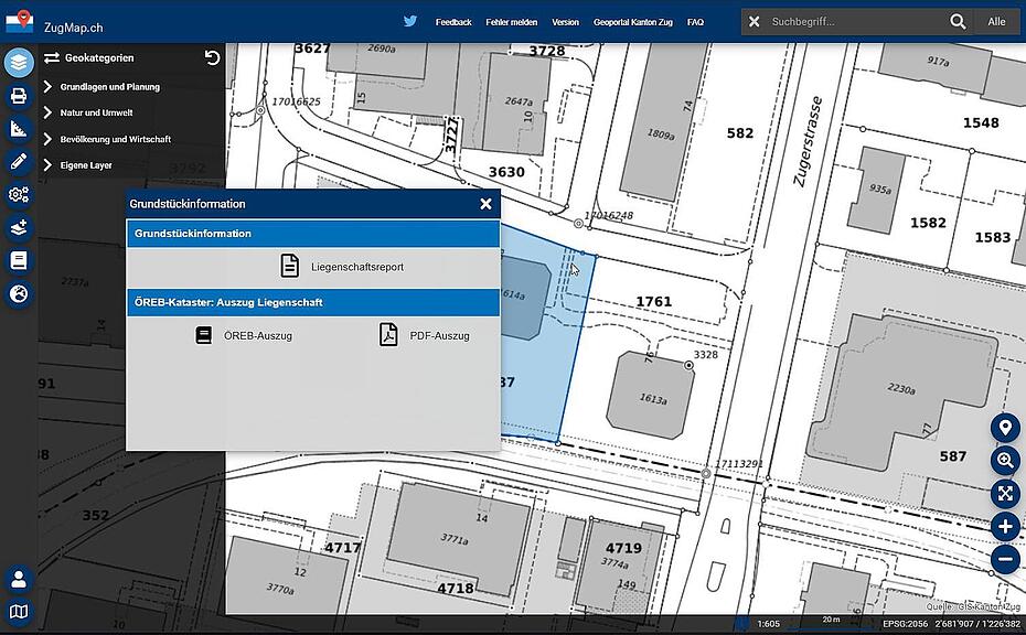 «Besonders erfreulich ist, dass das neue ZugMap.ch gleichzeitig die Plattform ist, auf welcher der ÖREB-Kataster publiziert wird», so Hess weiter. Die Abkürzung ÖREB steht für öffentlich-rechtliche Eigentumsbeschränkungen, die aufgrund von Gesetzen und Verordnungen bestehen: Bauzonen, Bebauungspläne, Lärmempfindlichkeitsstufen, Grundwasserschutzzonen, Waldgrenzen, Baulinien von Nationalstrassen usw. Neu kann man diese für ein Bauvorhaben oder einen Grundstückkauf relevanten Beschränkungen über das Internet abfragen und braucht sie nicht mehr bei mehreren Behörden einzeln in Erfahrung zu bringen. «Das ist kundenfreundlich und effizient», so Markus Hess. Die in ZugMap.ch angezeigten Karten können kostenlos auch in anderen Anwendungen verwendet werden. Dies bringt den Vorteil, dass die angezeigten Informationen überall identisch sind und damit auch den gleichen Stand aufweisen. Dies schafft laut Medienmitteilung Rechtssicherheit und Transparenz.