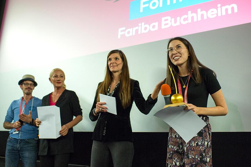 Der Saal erhellt sich wieder, als Studer-Husar die Award-Verleihung ankündigt. Aufmerksamen Zuschauern wird nämlich nicht entgangen sein, dass zwischen den roten Kinostühlen und der weissen Leinwand drei goldene Kirschen liebevoll auf einem kleinen Tisch platziert wurden. Diese Awards verleiht eine Jury von internationalem Format für die Kategorien «Bester Film», «Publikumspreis» und «Nachwuchspreis». Auf die Bühne werden jedoch nur zwei Personen gebeten: Julian Quentin holte sich mit seinem Werk «Highway» den Nachwuchspreis. Sowohl der Jury als auch dem Publikum hat jedoch Fariba Buchheims Dokumentarfilm «Formen» am besten gefallen. In diesem wird der etwas «andere» Rücken porträtiert; einer der gezeichnet ist von Narben, Krümmungen und Verformungen. Sichtlich überwältigt nimmt Buchheim die Preise entgegen und sagt: «Das ist grossartig. Vielen Dank!»