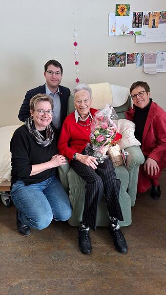 Agnes Waser-Kuster durfte am vergangenen Donnerstag ihren 100. Geburtstag feiern. Ihre blauen Augen strahlten, als sie die Glückwünsche von Regierungsrätin Cornelia Kaufmann-Hurschler und Talammann Mike Bacher entgegennahm. Erst vor zwei Jahren zog sie ins Alters- und Pflegeheim Erlenhaus in Engelberg. Zuvor lebte sie dank Unterstützung von ihrer Familie in der eigenen Wohnung. Agnes Waser spüre ihr hohes Alter und sei dankbar für die Pflege und Begleitung des Erlenhausteams. Sie sei stolz, dieses hohe Alter erreicht zu haben, meinte die Jubilarin und freute sich, dass die Familie und Freunde zum Geburtstagsessen zusammenkamen. (zvg)