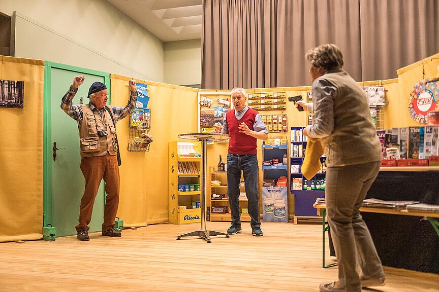 Und worum geht's im Stück? Kioskfrau Stutz wird von einem bewaffneten Kriminellen überfallen. Doch sie lässt sich nicht einschüchtern. Sie verpasst dem Täter eine saftige Ohrfeige und schnappt sich seine Pistole.