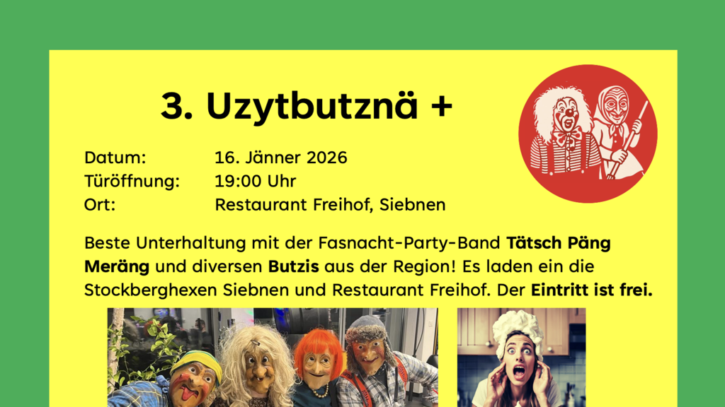Das Uzytbutznen wurde im Jahr 2024 von den Stockberghexen Siebnen ins Leben gerufen. Ziel dieses Anlasses ist es, wieder mehr Gäste und Butzis in die Restaurants zu bringen und gemeinsam die Fasnacht zu feiern. Im Restaurant Freihof in Siebnen bewirtschaften die Stockberghexen zahlreiche Gäste. Für beste Stimmung sorgt die Fasnachtsband Tätsch Päng Meräng, begleitet von verschiedenen Butzis aus der Region.