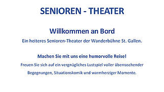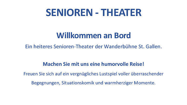 Die Reformierte Kirchengemeinde Brunnen-Schwyz & Arth-Goldau in Zusammenarbeit mit der Fachstelle Alter der Gemeinde Schwyz lädt herzlich zu einem besonderen Theaternachmittag ein. Mit dem Stück "Willkommen an Bord" bringt die Senioren-Wanderbühne St. Gallen ein humorvolles und lebensnahes Theater auf die Bühne, das speziell Seniorinnen und Senioren und deren Angehörige anspricht.